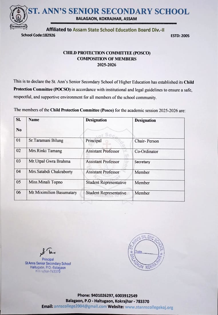 In alignment with the Protection of Children from Sexual Offences (POCSO) Act and guided by the institution’s enduring commitment to child-centric education, the Child Protection Committee of St. Ann’s Senior Secondary School is constituted as a vigilant, compassionate, and responsive body. The Committee serves as a moral and institutional safeguard, ensuring that every child within the school campus is protected from harm, respected in dignity, and nurtured in an environment of trust, security, and justice.