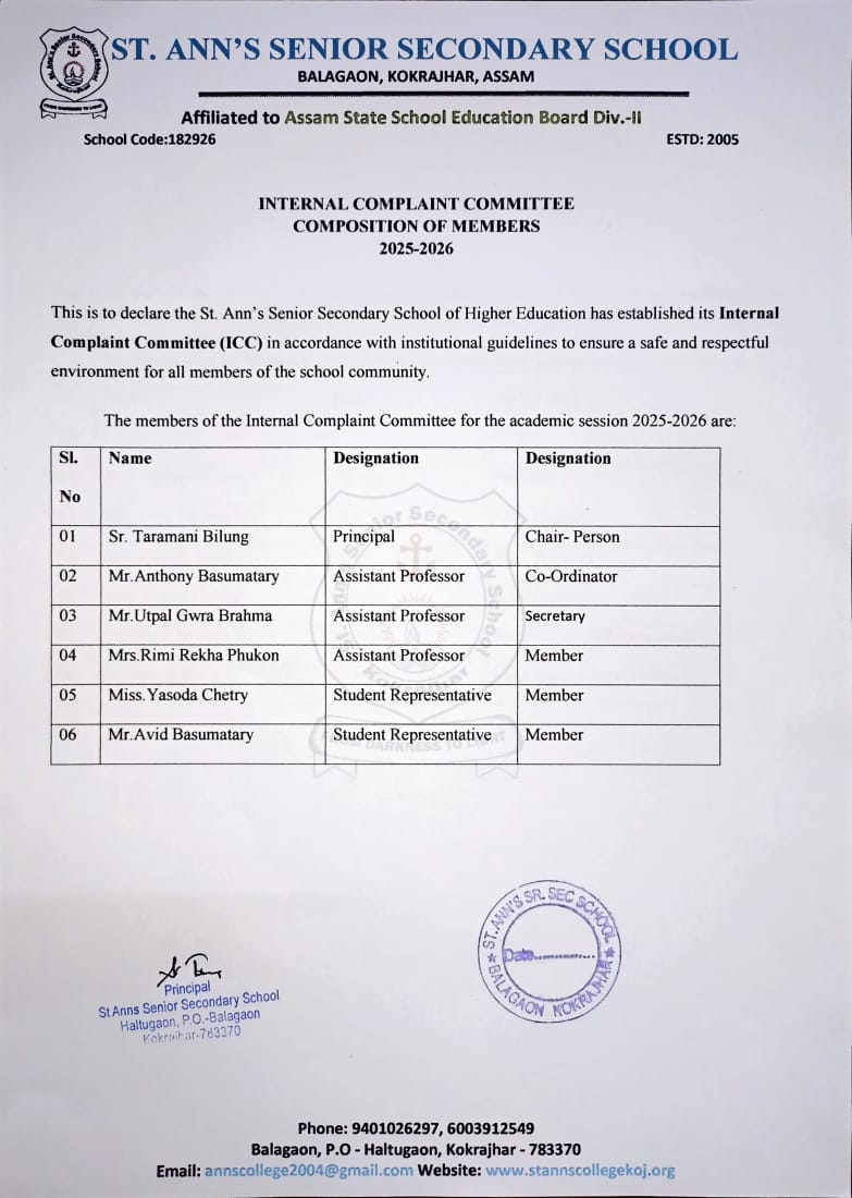 Recognizing the imperative of maintaining a secure and equitable environment, St. Ann’s Senior Secondary School, Kokrajhar has instituted the Internal Complaint Committee (ICC). The ICC stands as an emblem of trust, ensuring that every member of the school community—students, staff, and faculty alike—can voice grievances without fear, particularly concerning issues of harassment, discrimination, or any form of injustice. By fostering a culture of transparency and accountability, the ICC not only safeguards rights but nurtures the moral and ethical essence of the institution.